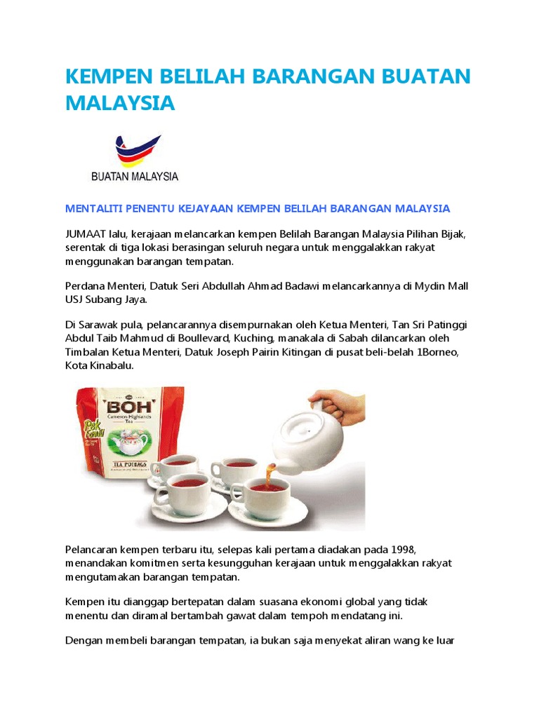 Belilah Barangan Buatan Malaysia 2 from imgv2-1-f.scribdassets.com Dewasa ini, hampir semua produk yang terdapat di pasaraya adalah buatan tempatan. Barang kita pun ada kualiti juga. Dasar belilah barangan buatan malaysia. Penglibatan kerajaan dalam menjamin barangan buatan malaysia untuk menjadi barangan yang bermutu amat kita hargai,dan kita berharap suatu hari nanti,agar setiap antara kita merasa bangga memiliki apa jua barangan yang di labelkan barang buatan. Barang buatan malaysia ialah barang yang dihasilkan di dalam negara. Blog ini digunakan untuk mengumpul maklumat serta mendapat maklum balas serta pendapat daripada anda dan blogger yang lain mengenai barangan. Dengan membeli barangan buatan malaysia, ia mampu memberi pekerjaan kepada rakyat malaysia. Slogan belilah barang buatan malaysia merupakan slogan yang sering kita dengar sama ada di televisyen atau di radio.